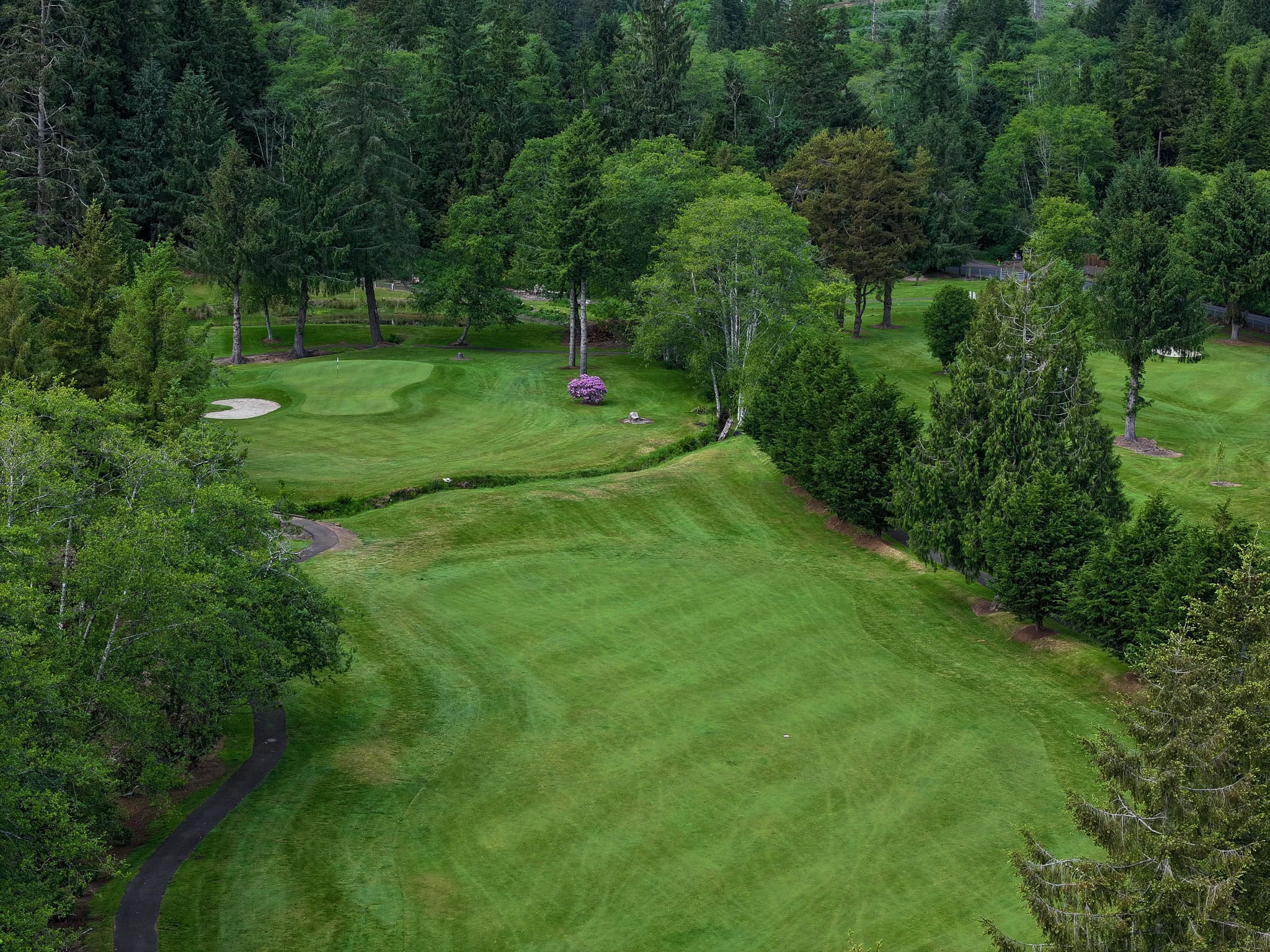 Named for the Double Lavender Hydrangea, also known as the Forever & Ever Together Hydrangea, this hole celebrates one of the Oregon Coast’s most vibrant and enduring blooms. A hortensia macrophylla variety, it flourishes in the cool, misty coastal air—its lush, rounded blossoms shifting in color with the soil beneath them. In acidic ground, the petals glow soft lavender; in more basic soil, they blush rosy pink. As the season matures, the flowers antique into jewel tones, deepening into brilliant burgundy by fall.
